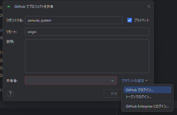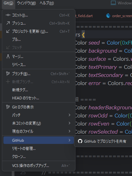9. 「Git」>「GitHub」>「GitHubでプロジェクトを共有」の順にクリックする。