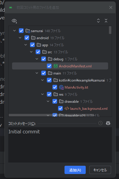 13. 「初回コミット用のファイルを追加」が表示されるので、「追加」をクリックする。