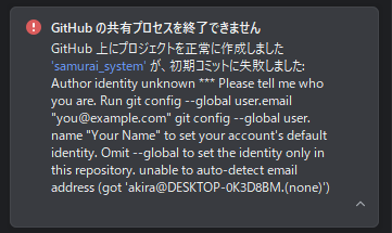 注意:下記が表示された場合、Gitに作者情報が登録されていないため、登録に失敗しているっぽい。