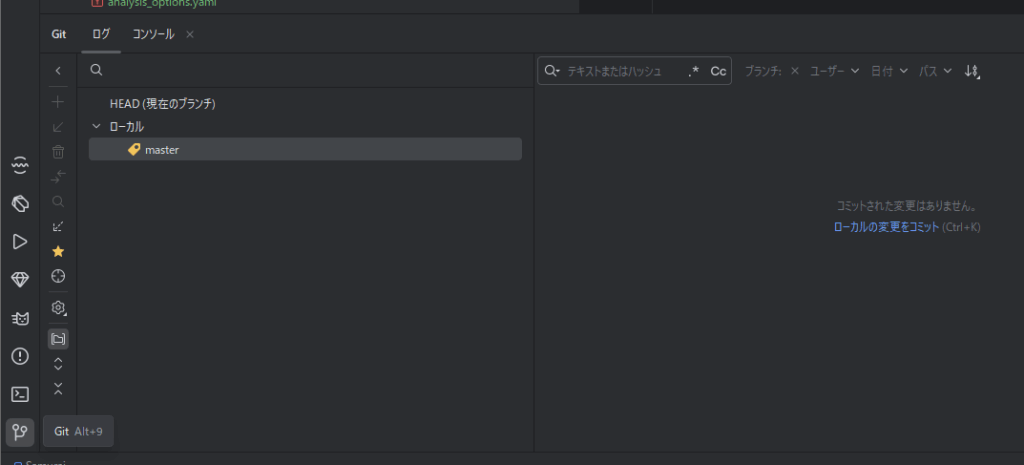 git config --global --list「Git」>「ローカルの変更をコミット」の順にクリックする。