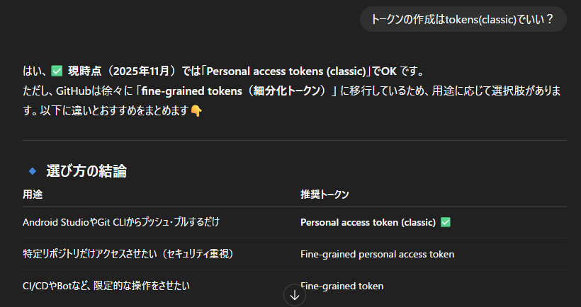repo | すべてのプライベートリポジトリにフルアクセス(Push・Pull・Issue・PRなど) | ✅ 必須(Git操作に必要) |