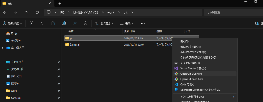 - GitHubにあげたいフォルダ>右クリック>Open Git Bash hereをクリックする。