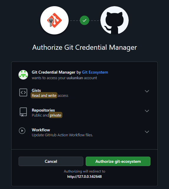 $ git push -u origin main9. 「Sign in with your browser」>「Authorize git-ecosystem」をクリックする。